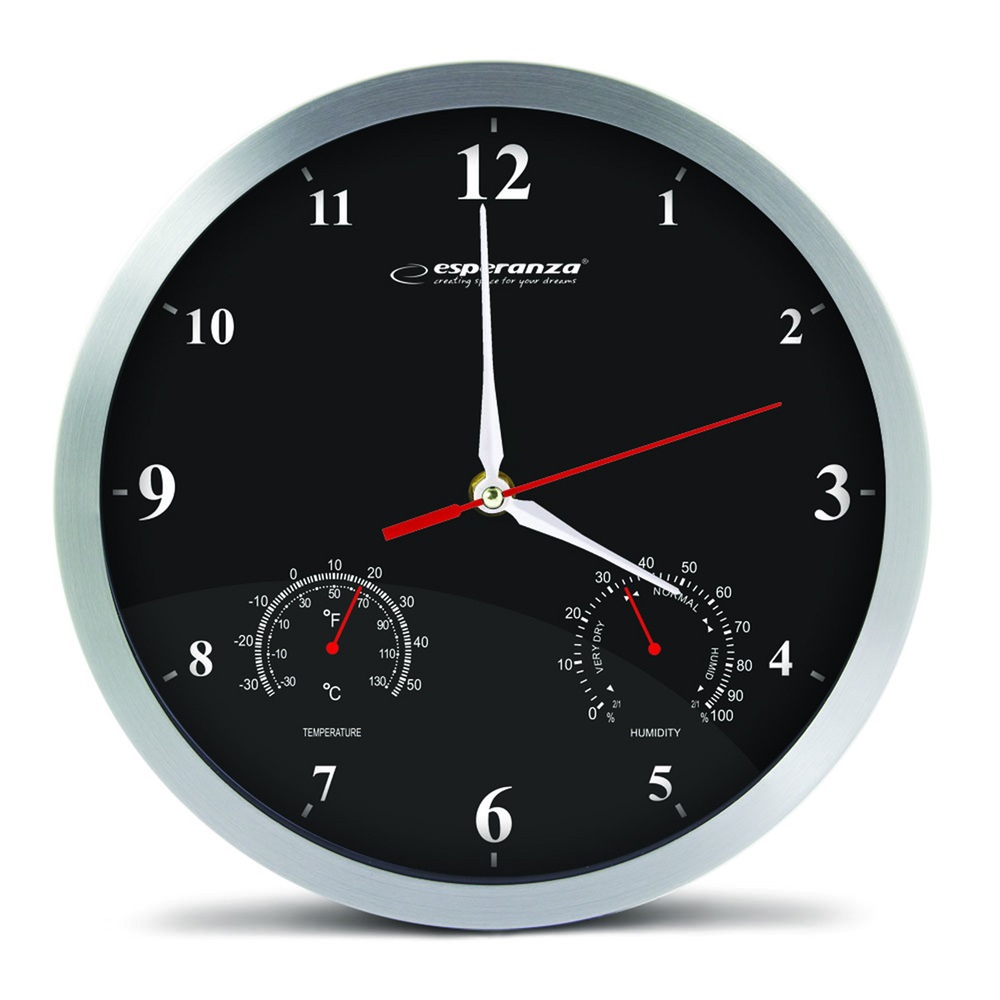 Ez az óra nem csak pontos időt mutatja, hanem a szobahőmérsékletet és páratartalmat. A rendkívül elegáns és stílusos kialakításnak köszönhetően kiválóan illeszkedik a lakások, irodákat, üzleteket és éttermeket berendezéseihez. A nagyméretű tárcsa lehetővé teszi, hogy az idősebb személy számára is könnyedén látható legyen a pontos időt, bárhol a helyiségben. Átmérő: 30 cm, Vastagság: 4 cm, Anyag: Alumínium keret, Óra tárcsa lemez: művészeti papír, Tápegység: 1x AA elem (nem tartozék), Csendes mechanikus mozgás – sima működés, Extrém pontos mechanikus mozgás: kvarc, Beágyazott horog a könnyű telepítéshez, Mérések: hőmérséklet és páratartalom, Mérési hőmérséklet tartomány: -30 C ~ + 50 C Celsius , -30 ° F ~ 110 F (Fahrenheit fok), Páratartalom mérési tartomány: 0 ~ 100% 1 év garancia Gyártó: Esperanza Szélesség cm: 31,6 Hosszúság cm: 4,6 Magasság cm: 31,5 Katalóguskód: 28504