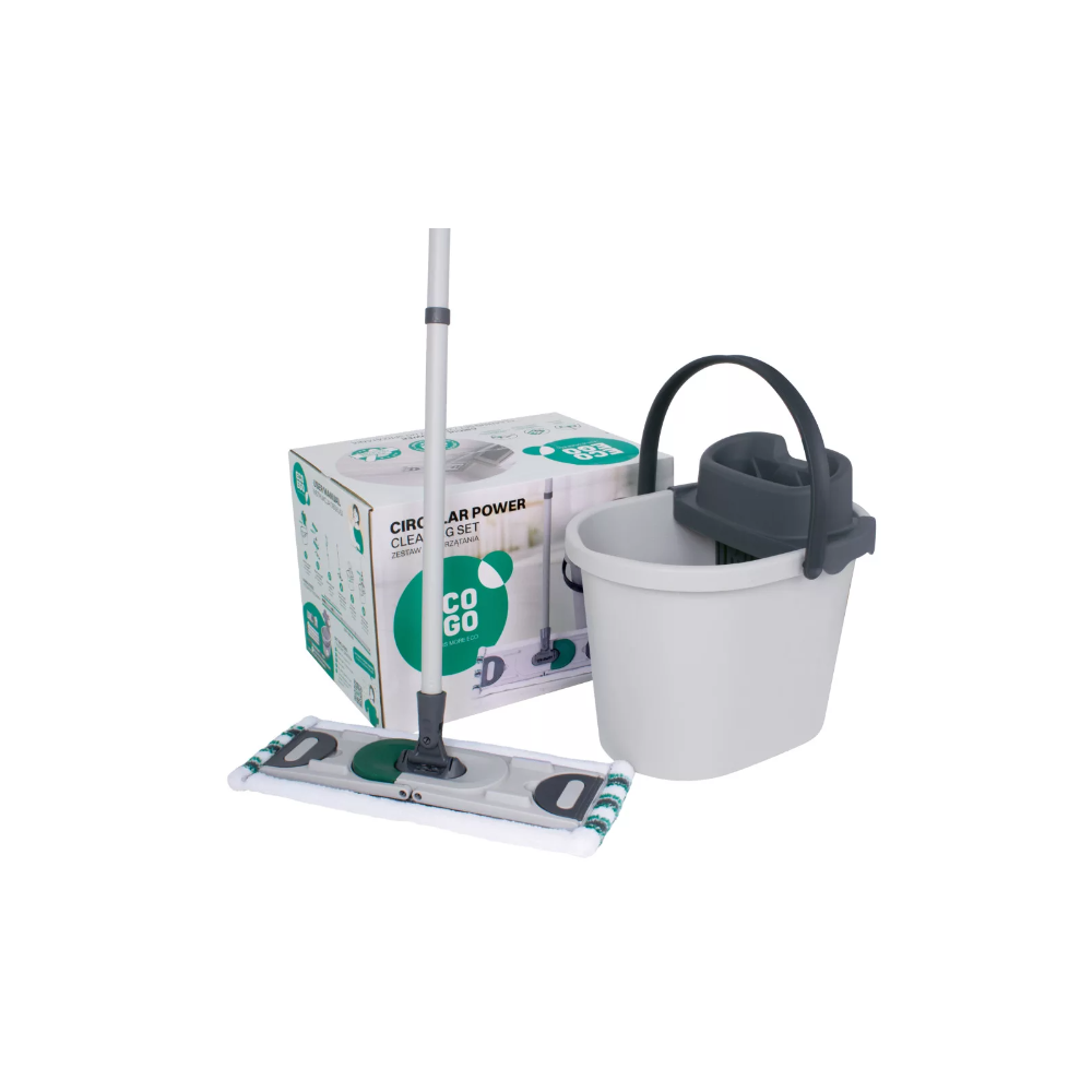 A CIRCULAR POWER készlet négy elemből áll: vödör, prés, egy lapos felmosó és egy menetes nyél. Az univerzális és funkcionális felmosóval bármilyen felületet – panelek, finom parketta, csempe, linóleum és természetes kő – tisztítható. Minden elem elfér egy vödörben, és egy kis tárolórekeszben vagy szekrényben tárolható.