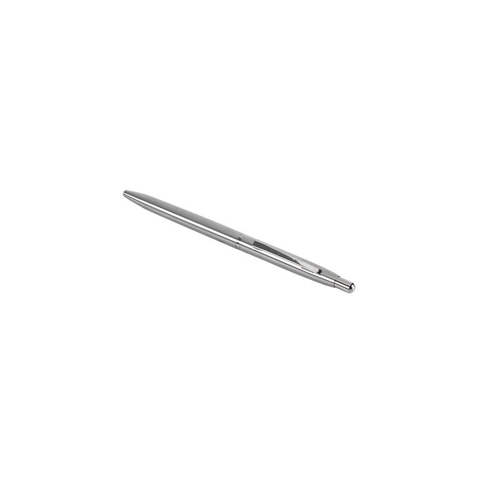 Nyomógombos mechanikával működő golyóstoll, cserélhető nagytartályos golyósbetét. Gravírozható fém tolltest, fém kiegészítők. Írásszín: kék. Vonalvastagság: 0,8 mm. Íráshossz: 5000 m. Katalóguskód: 19506