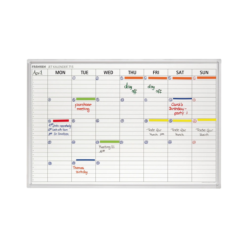 A kiszállított tábla sérülésmentes állapotáról a futár távozása előtt győződjön meg, mert annak állapotáról utólagos reklamációt nem áll módunkban elfogadni, megértésüket köszönjük!FRANKEN Hét/órák beosztású tervtábla. Az összes időpont és feladat rögzíthető egészen 25 dolgozó vagy tárgy vonatkozásában. 19 x 70 mm-es mezők, napi mező mérete: 19 x 108 mm. Egy fine markerrel, egy tábla irónnal és három színes mágnessel együtt szállítjuk. A termék felülete zománcozott, ami hosszabb élettartamot biztosítKatalóguskód: 34763