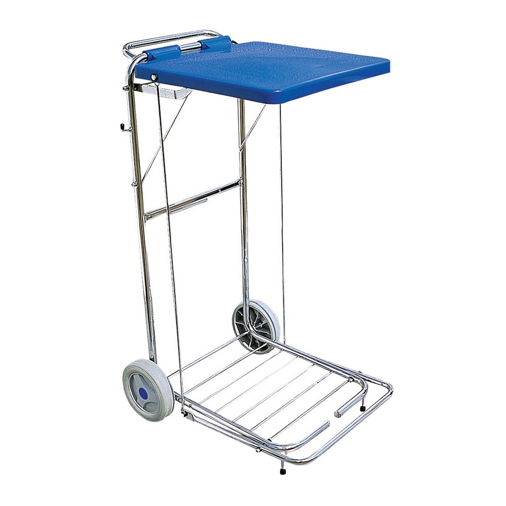 Szennyes/hulladékgyűjtő kocsi •kapacitás 120 l. •króm •önbeálló kerekek * kék fedéllel Méret: 51 × 50 × 94 cm Súly: 1 kg Színkódolt zsák opcionális tartozék.Katalóguskód: 44118
