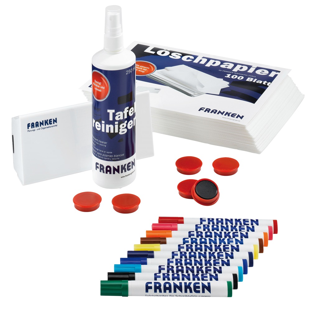 Indulókészlet fehér táblához: 10 db táblamarker, 10 db 32 mm mágnes, 1 db mágneses táblatörlő 100 ív törlőpapírral, 1 db 250 ml tisztítóspray. Katalóguskód: 30821
