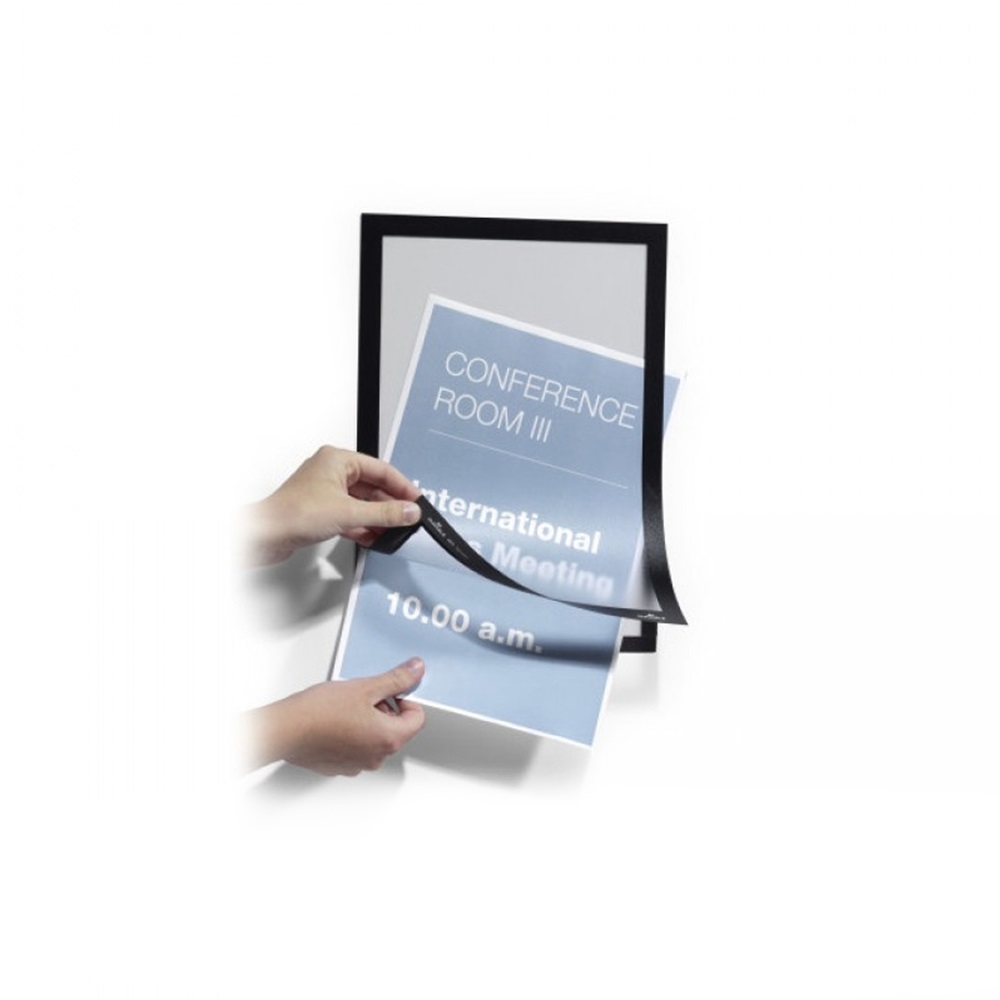 DURAFRAME® keret, öntapadó hátlappal és mágneses előlappal többféle méretben. A DURAFRAME® segítségével profin és kényelmesen helyezhetjük ki dokumentumainkat. Egyszerűen vegyük le a védőfóliát és ragasszuk fel az öntapadó keretet bármilyen sima, kemény felületre, például ablakra, iratszekrényre vagy ajtóra. A DURAFRAME® könnyedén áthelyezhető például üveg felületeken anélkül, hogy nyomot hagyna. • Információ kihelyezés professzionális módja • A kihelyezett dokumentumok egyszerű cseréje a mágneses záródásnak köszönhetően • Könnyen kihelyezhető bármilyen sima felületre • Felhasználási területek: hirdetések, információ kihelyezés, tájékoztatás, irányítás • Üvegen használva a keret mindkét oldalon látható, így két irányban is lehet kommunikálni, elegáns formában • Álló és fekvő formátumban is használható • Külső méret: 236 x 323 mm Katalóguskód: 24780