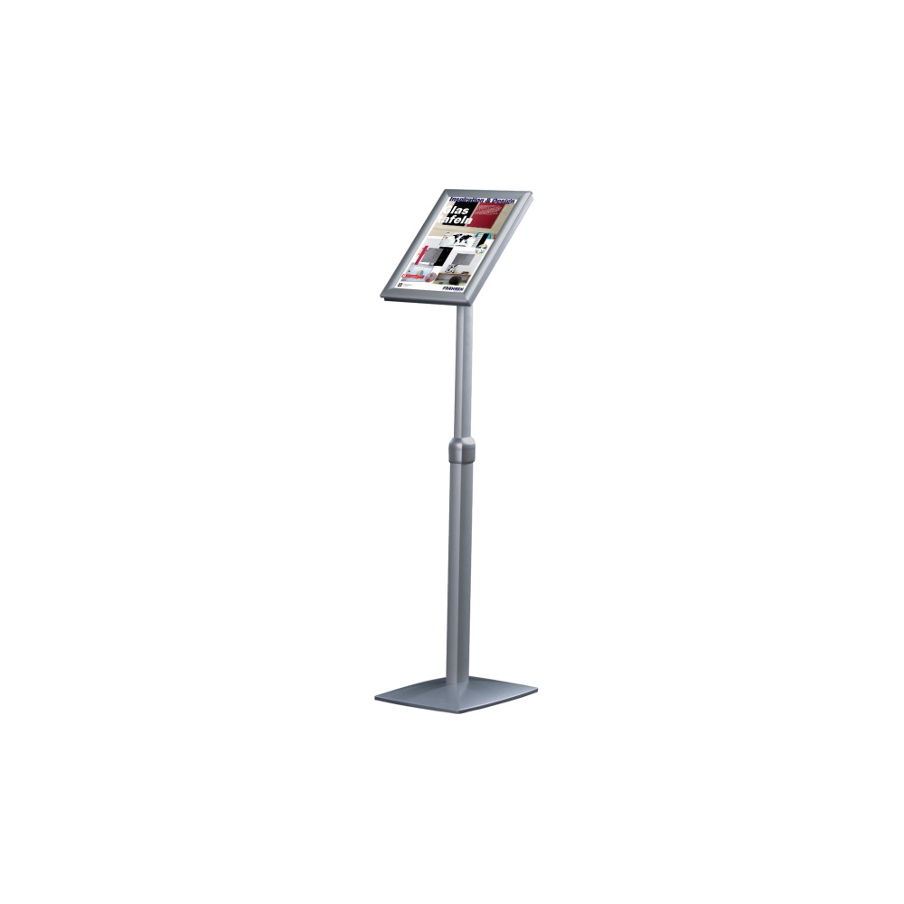 Univerzális ár- és információs állvány. Állítható magasság az A/4 esetében 86,5 és 125 cm, az A/3 esetében 91 és 131 cm között. Állítható fekvő vagy álló formátum, valamint változtatható dőlésszög. A billenő keretszerkezet lehetővé teszi az információs anyagok egyszerű és gyors cseréjét. A keret eloxált alumíniumból készült, dekoratív műanyag sarokelemekkel. Felülete UV-álló, tükröződésmentes fólia. 28 x 28 cm-es alu talp.