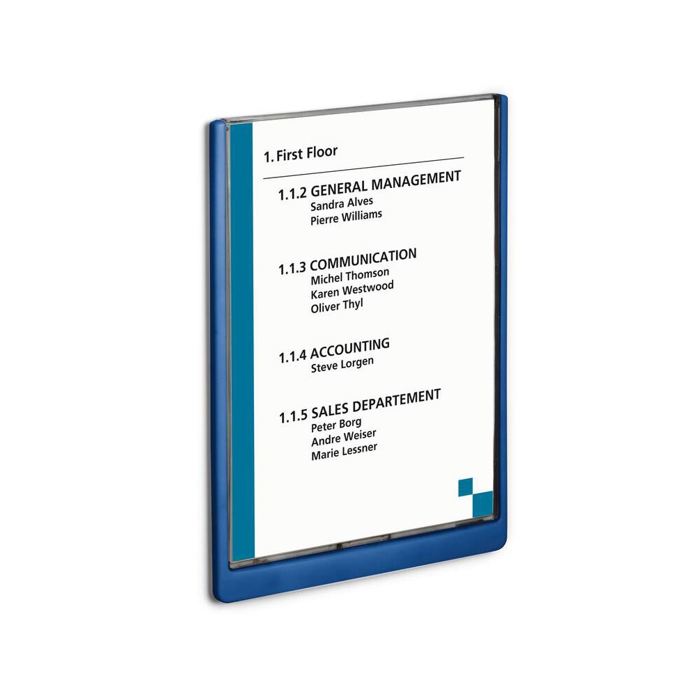 Irányítótábla, stílusosan megtervezett, lekerekített sarkokkal, így a modern design funkcióval párosul. Az insertek könnyedén cserélhetők az átlátszó panel kihúzásával. Ideális megoldás olyan helyeken, ahol az információkat gyakran kell cserélni, mint például hotelekben, konferencia termekben, kórházakban. Nyomtatható insertek külön kaphatók. Katalóguskód: 51749