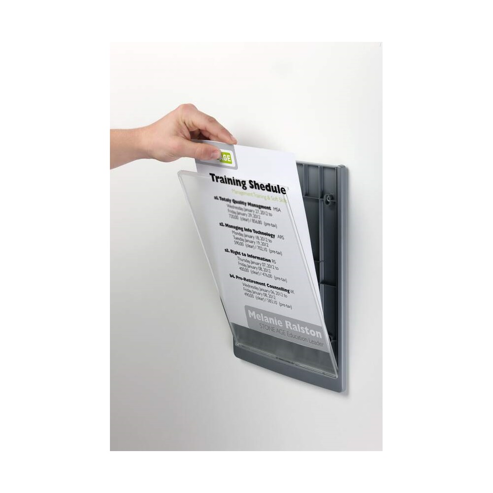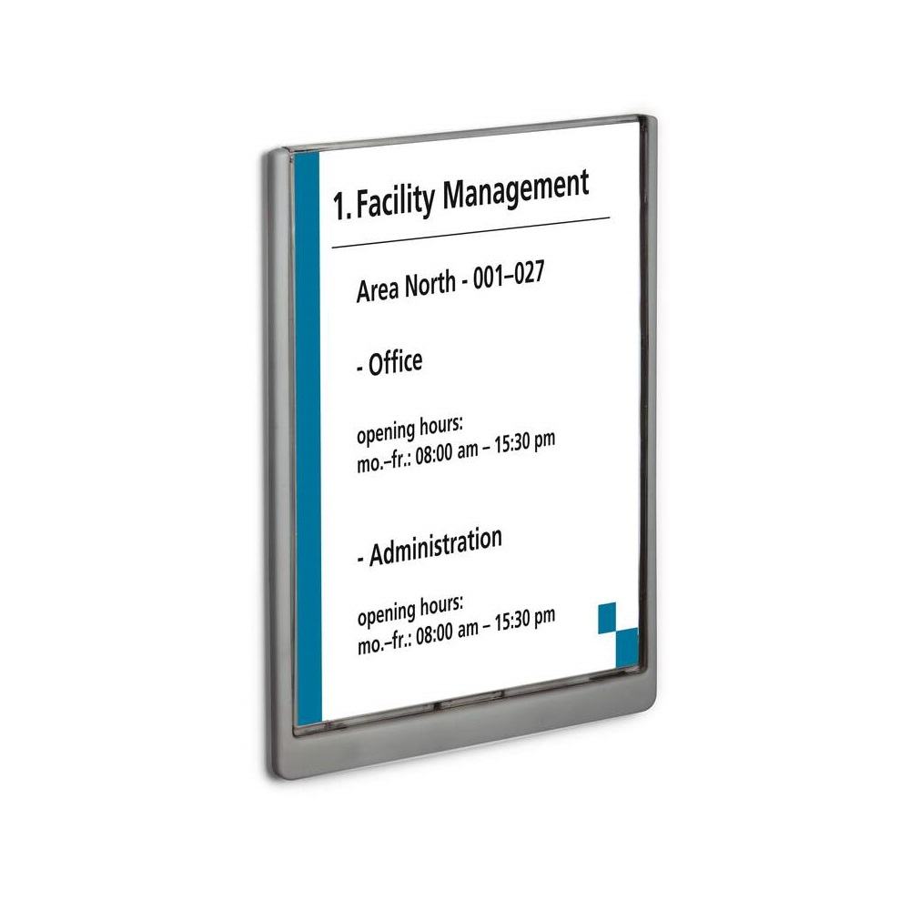 Irányítótábla, stílusosan megtervezett, lekerekített sarkokkal, így a modern design funkcióval párosul. Az insertek könnyedén cserélhetők az átlátszó panel kihúzásával. Ideális megoldás olyan helyeken, ahol az információkat gyakran kell cserélni, mint például hotelekben, konferencia termekben, kórházakban. Nyomtatható insertek külön kaphatók. Katalóguskód: 51747