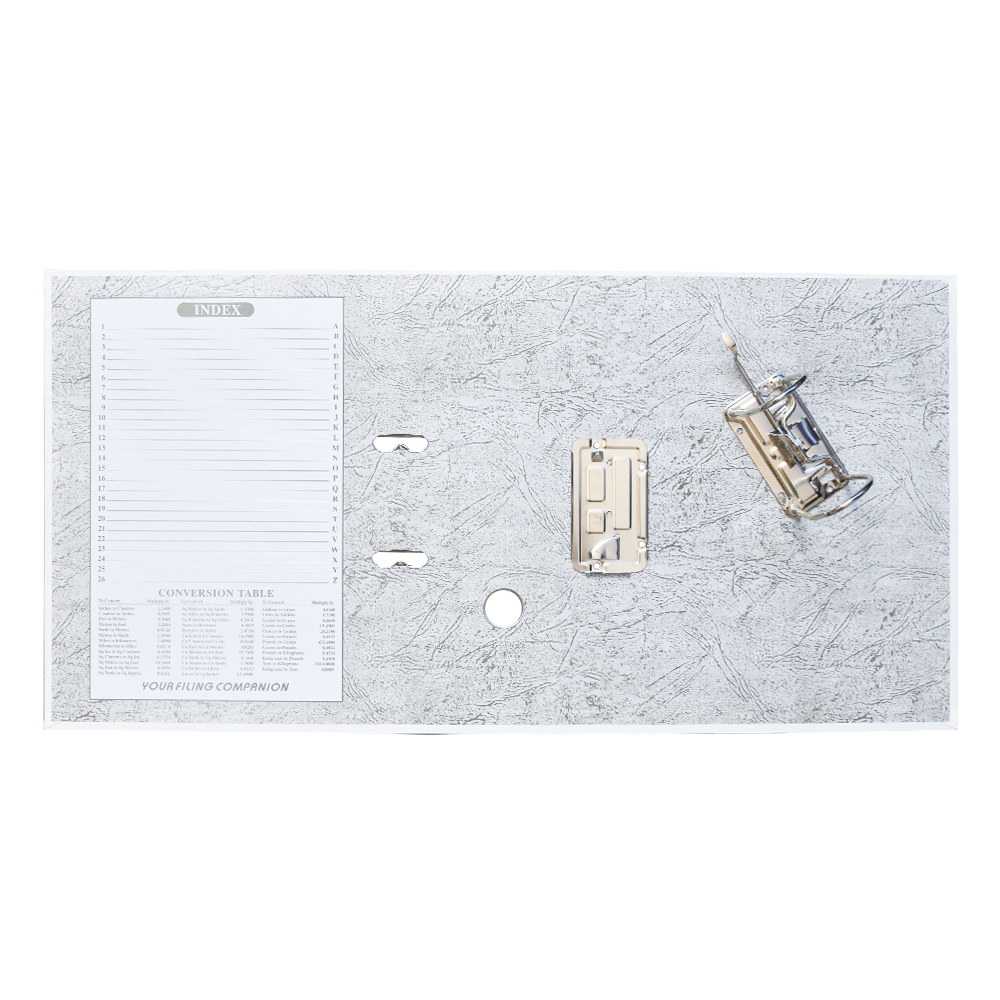 Emelőkaros iratrendező általános használatra. Kívül PP, belül fehér karton borítással, kihúzólyukkal. Cserélhető gerinccímke a feliratozáshoz. Tárolókapacitás 500 lap (A4 80gr.). A terméket lapra szerelve szállítjuk, a mellékelt emelőkaros szerkezet bepattintása gyors és egyszerű, 5 másodperc alatt elvégezhető és iratrendezőnk máris használatra kész! Katalóguskód: 12061