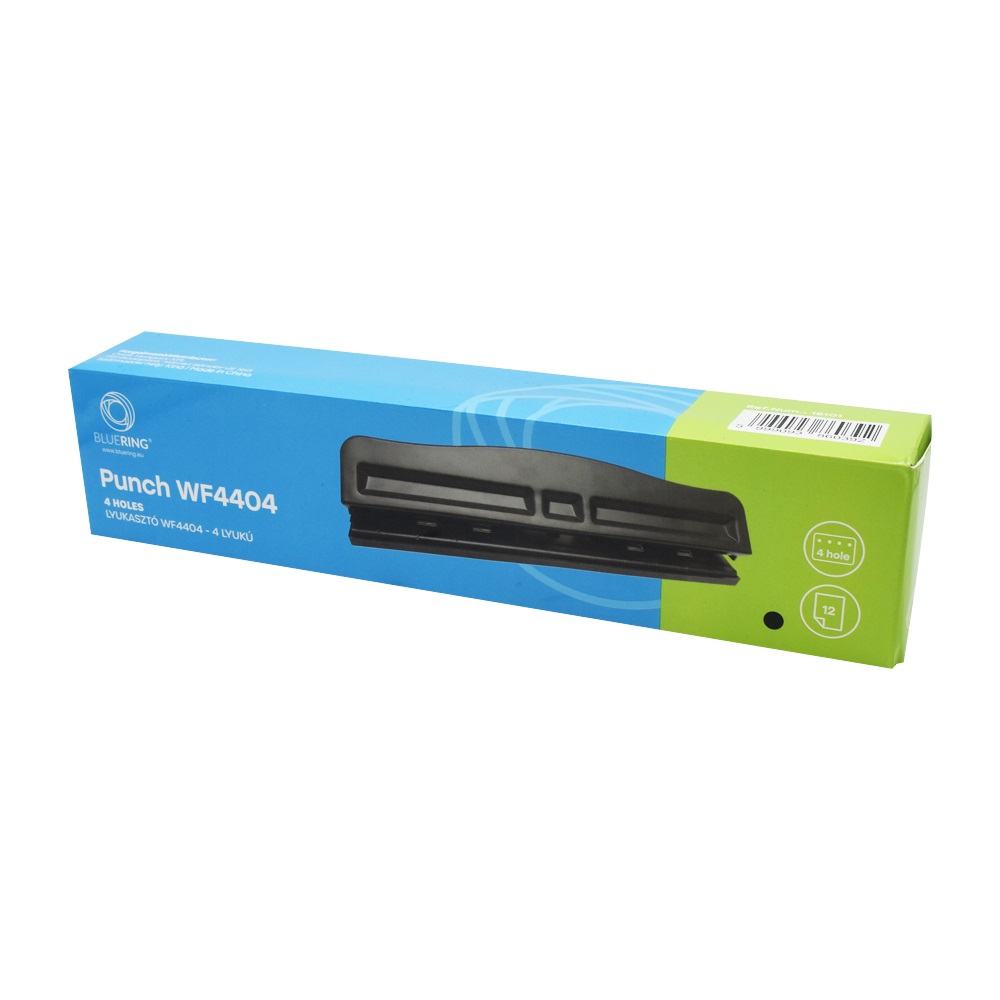 4 lyuk egyidejű lyukasztására alkalmas lyukasztógép. Könnyűfém test, fémszerkezet, ütköztetőléc, Egyszerre lyukasztható lapok száma: 12 lap.Katalóguskód: 18101