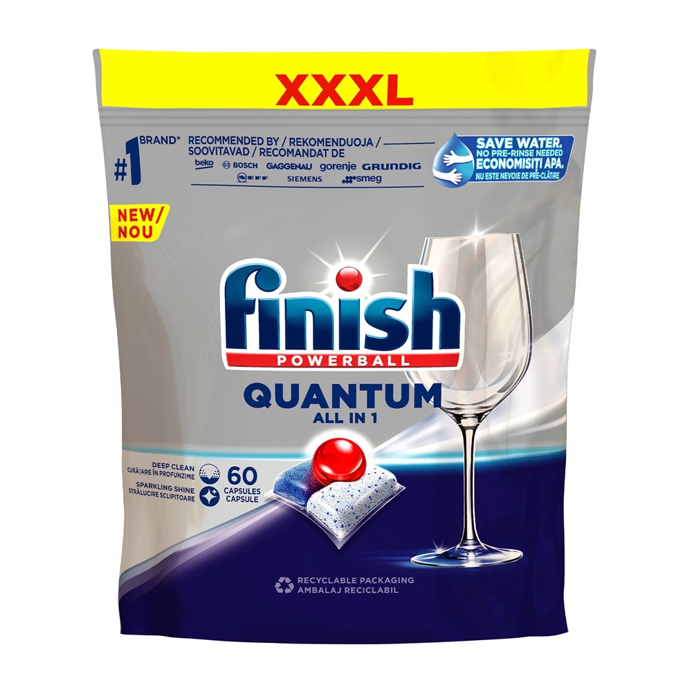 Finish Quantum kapszula a tiszta és csillogó edényekért már az első használattól kezdve, minden alkalommal, még a legnehezebb vízviszonyok között is. Kompakt, három-kamrás formulája hatékonyan távoltja el a legmakacsabb ételmaradékokat az edények előöblítése nélkül is, valamint további védelmet nyújt az üvegkorrózió ellen. A Finish Quantum újrazárható zacskóban kapható, így nincs szükség az egyes kapszulák kicsomagolására.