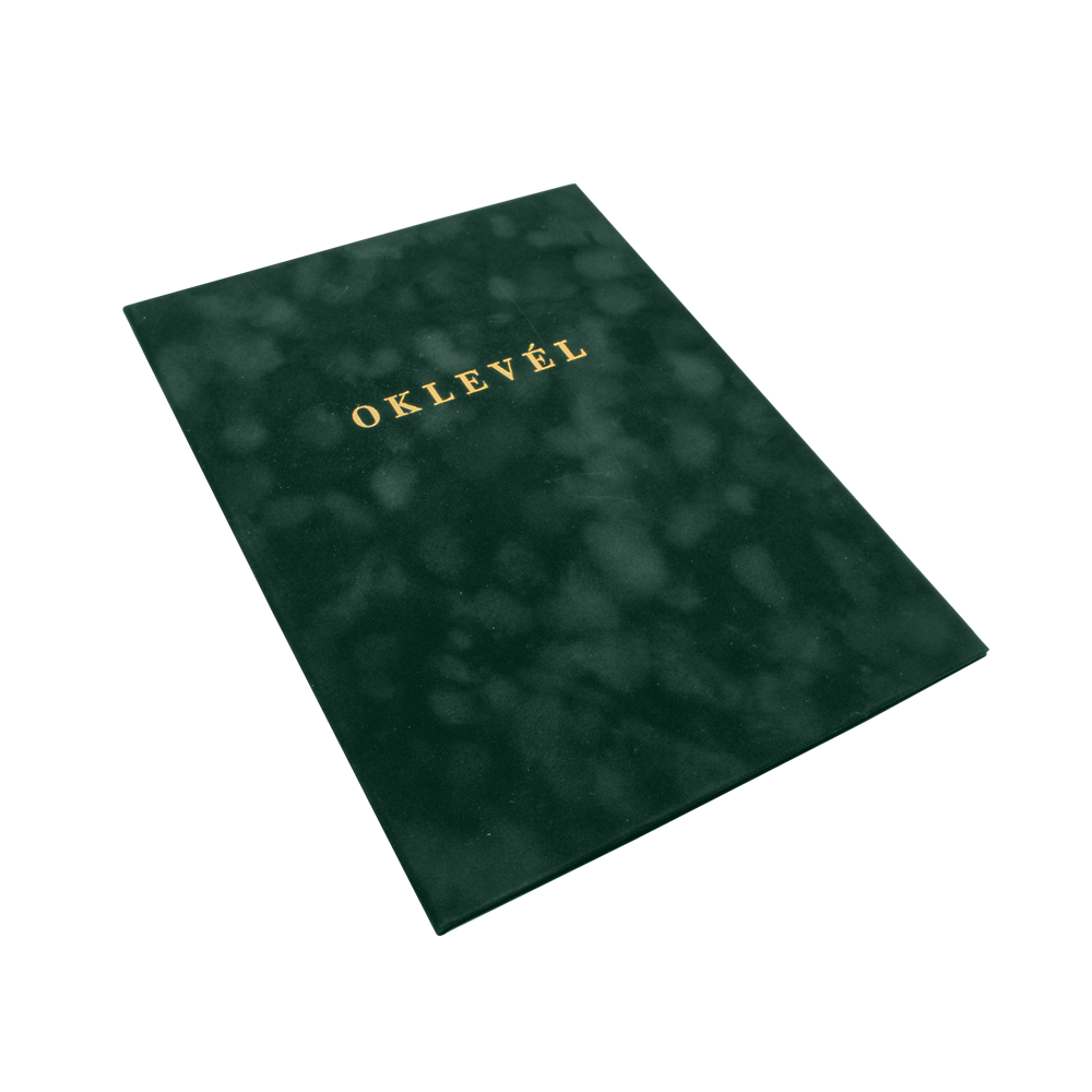 A4 méretű oklevelek tárolására alkalmas, plüss borítás, nyitott állapotban, jobb oldalon 4 szatén szalaggal. Borítón arany „OKLEVÉL” nyomattal