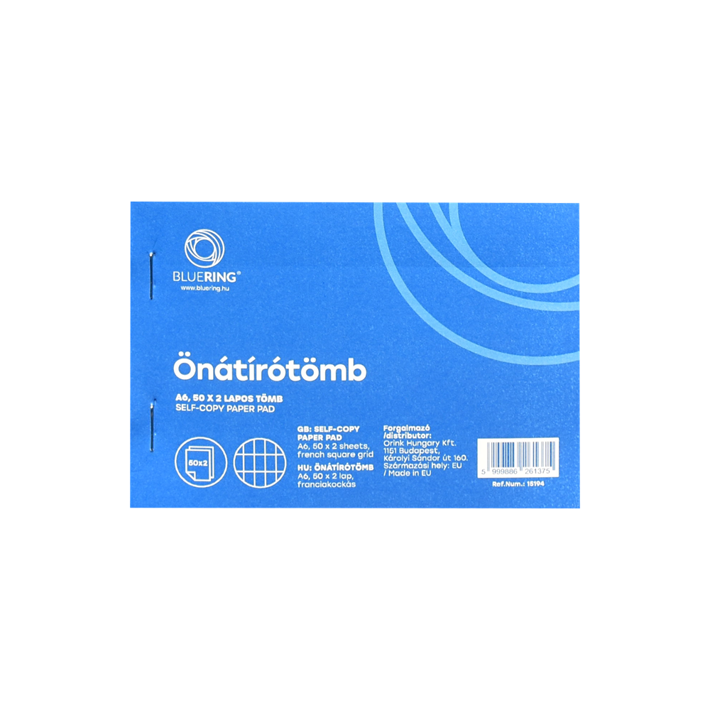 Önátíró vegykezelt papírból készült jegyzettömb 50×2 lapos kivitelben, A6, A5 ésA4 méretben. Az első példány franciakockás, míg a második (bent maradó) sima tőpéldány. 40 db/csomag. Katalóguskód: 15194
