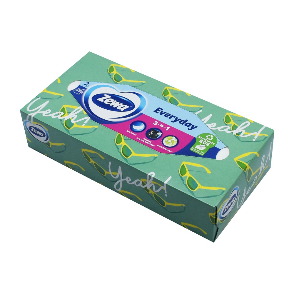Jó választás a család minden tagjának: az új Zewa Everyday dobozok megbízhatóan jó minőségű papír zsebkendőt kínálnak. Orrfújáshoz, kozmetikai felhasználásra, kéztisztításra, gyümölcsök letörlésére… nincs olyan feladat a mindennapokban, amelyre ne tudnának megoldást. A dobozokat színes, vidám, könnyed design teszi mindenki kedvencévé.