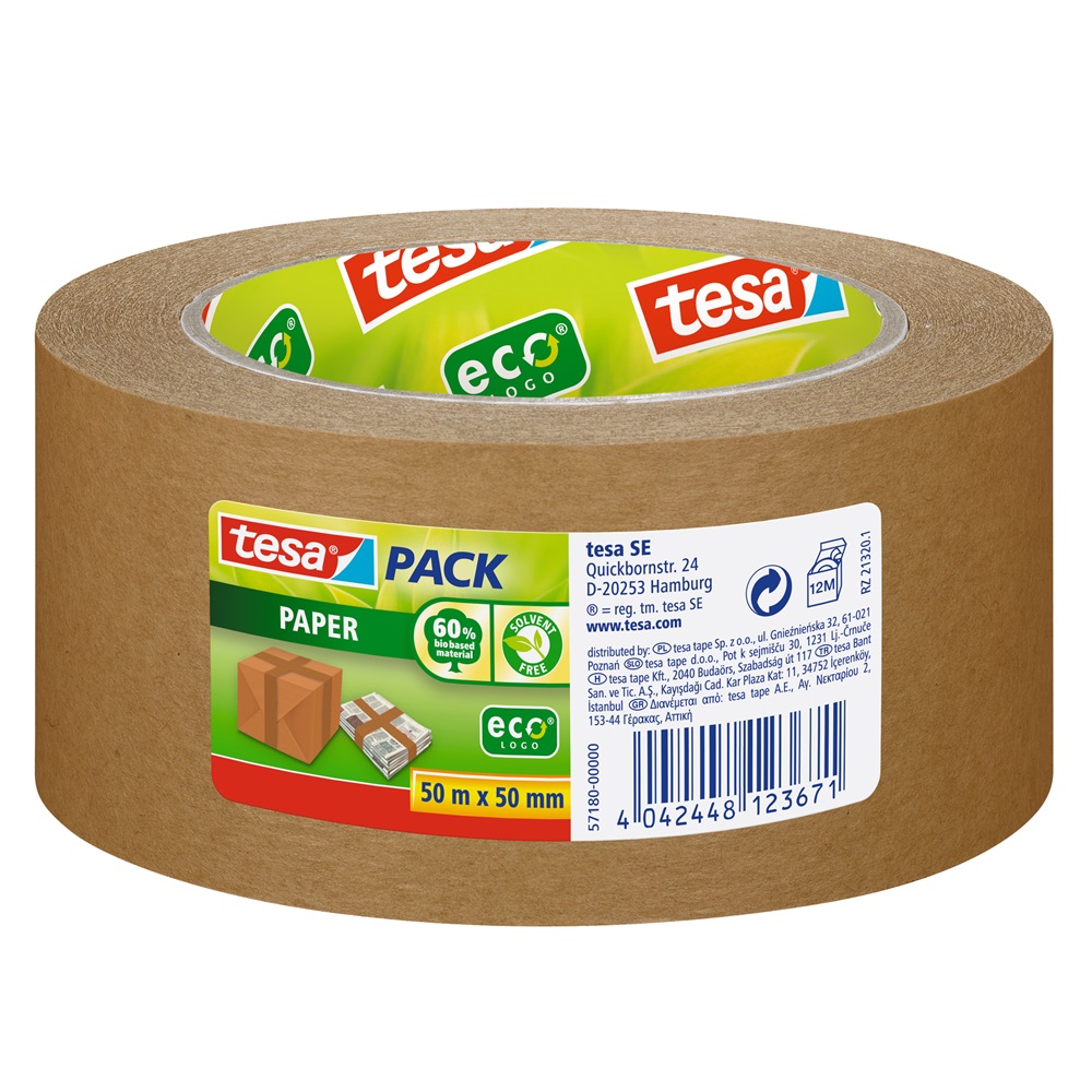A tesapack® papír csomagolószalag egy környezetbarát kartonlezáró szalag. Magas újrahasznosított száltartalmú, fehérítetlen papírból készült, erős papír hordozóval rendelkezik. A szalag kézzel könnyen téphető, mégis biztonságos lezárást nyújt bármely karton, csomag vagy boríték számára. Oldószermentes ragasztóanyaga mentes bármilyen mérgező vegyi anyagtól. A tesapack® környezetbarát papír csomagolószalag használata azonos anyagú kartonlezárást és csomagolást biztosít, ami viszont elősegíti a csomagolóanyag könnyű újrahasznosítását. Katalóguskód: 34332