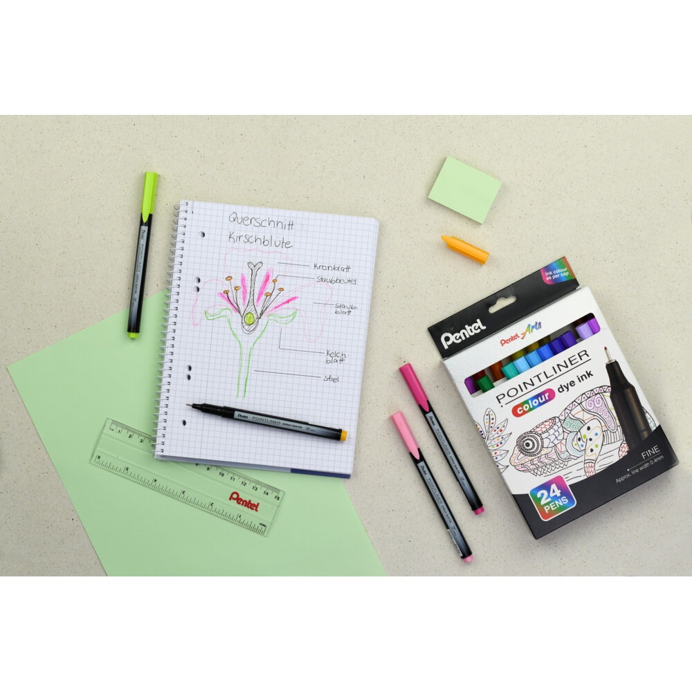 A Pentel színes tűfilc egy vékony hegyű, műanyag írócsúccsal és vízbázisú (dye) tintával ellátott tűfilc, amely a Pentelre jellemző kiemelkedő minőséget képviseli. Kifejezetten ajánlott finom íráshoz, javításhoz, rajzoláshoz és vázlatkészítéshez, hiszen a 0,4 mm-es hegy pontos és precíz vonalvezetést tesz lehetővé. Az élénk, gazdag színeknek köszönhetően a munka nemcsak pontos, hanem látványos is lehet. A tűfilc 24 különböző színben érhető el, így minden feladathoz vagy kreatív projekthez megtalálható a megfelelő árnyalat. Használat után a tinta kiszáradásának elkerülése érdekében mindig gondosan zárd vissza a kupakot. A Pentel tűfilc megbízható társ a mindennapokban, legyen szó tanulásról, munkáról vagy szabadidős alkotásról.1 darab zöld rózsaszín