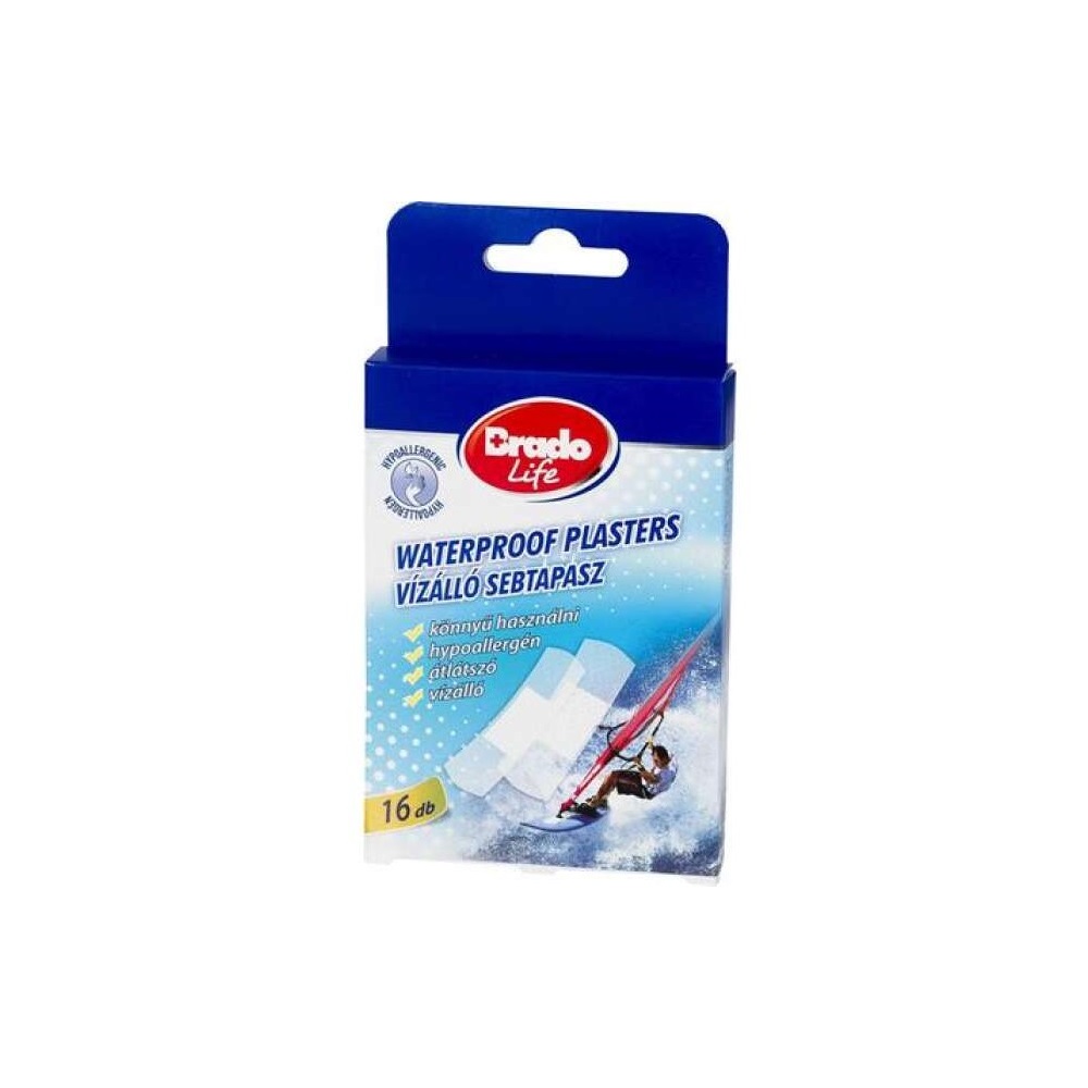 A doboz tartalma: 16db vízálló sebtapasz (8db 7×2 cm, 8db 7×2,4 cm)