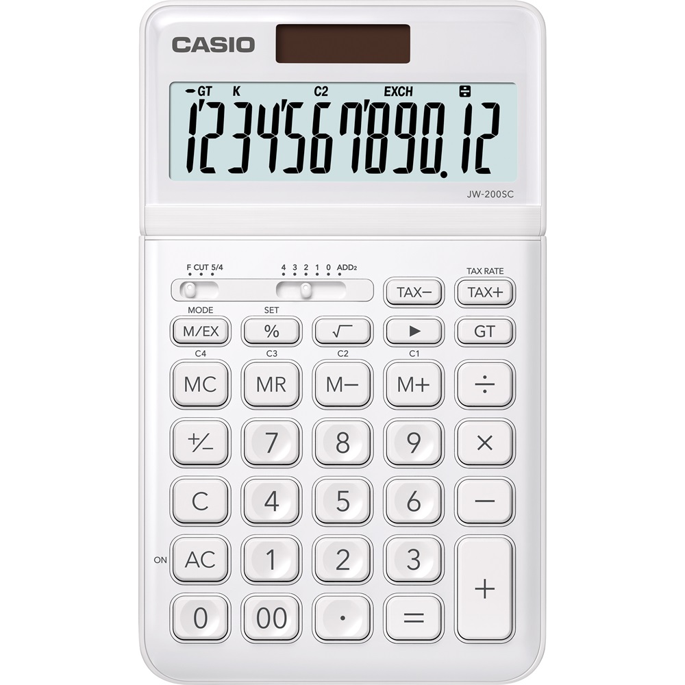 12 számjegyű, NAGY DÖNTÖTT KIJELZŐ, „stylish design” sorozat, elem+napelem, fémház, %, árrés számítás, valutaváltás, ÁFA számítás, memória, +/-, GT, kerekítés, utolsó számjegy javítása, gyökvonás, 00, FEHÉR Katalóguskód: 42538