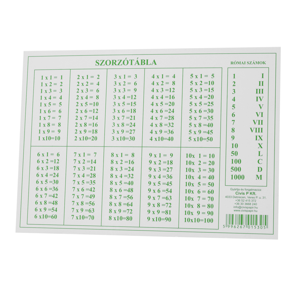 Műanyag szorzótábla gyerekek részére. A szorzótáblán kívül római számokat is tartalmaz. Méret: 15×10 cm Katalóguskód: 34497 Hiteles tájékoztatás: Elkötelezettek vagyunk termékeink biztonságának garantálásáért, nyomon követjük a termékbiztonsággal kapcsolatos valamennyi európai uniós és hazai szabályozást és biztosítjuk termékeink azoknak történő megfelelését. Az EU 2023/988-as számú Általános Termékbiztonsági Rendeletét (GPSR) is alkalmazzuk, így ha a termékeink biztonságát illetően fogyasztóként kérdése, észrevétele van, vagy esetleg balesetről van tudomása, kérjük, írja meg nekünk. GPSR: Cívis P Kft 4033 Debrecen, Veres Péter u.31. Email: info@civispapir.hu