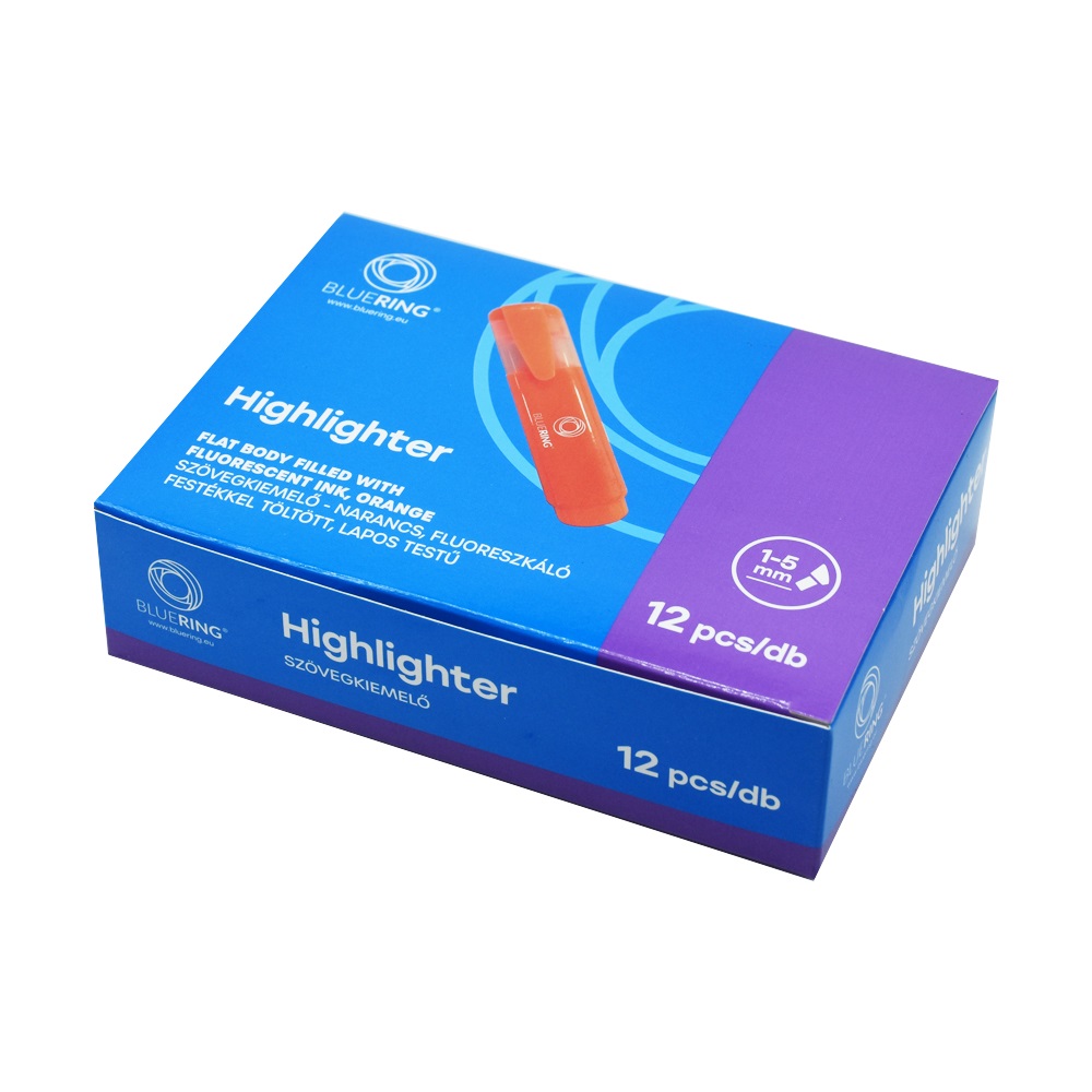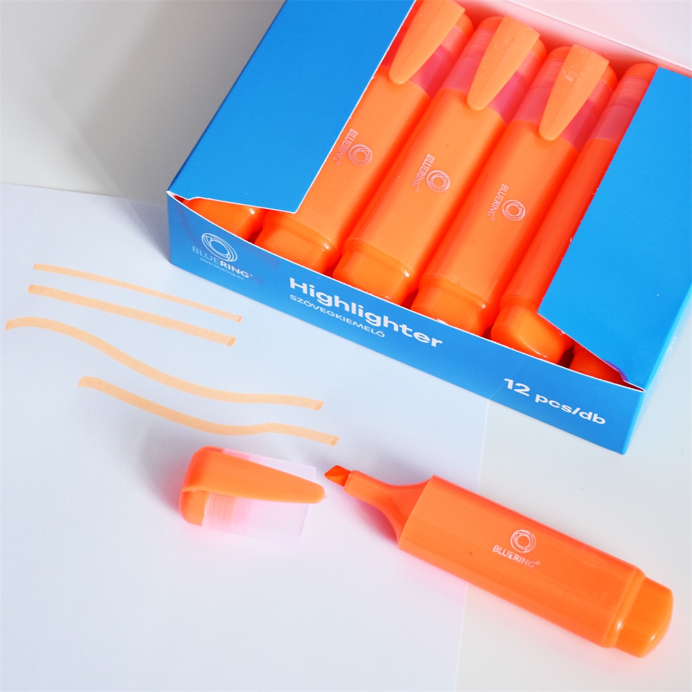 Speciális fluoreszkáló festékkel töltött szövegkiemelő. A kiemelt szöveg fénymásolható,faxolható. Klippel ellátott kupak, mely légmentesen zár. Festék színével megegyező kupak és testszín. Vágott csúccsal, 5 féle élénk színben és 2 féle készletben.Vonalvastagság: 1-2 mm (íróhegy élével), 3-5 mm (íróhegy lapjával). 12 db/doboz, 144 db/gyűjtő, 864 db/karton Katalóguskód: 1423