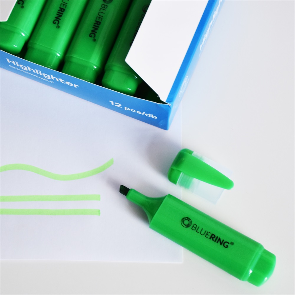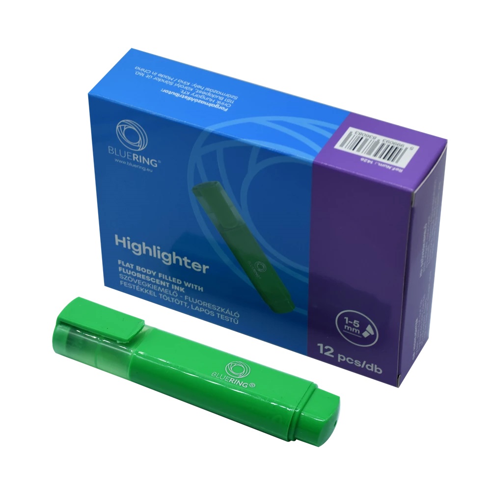 Speciális fluoreszkáló festékkel töltött szövegkiemelő. A kiemelt szöveg fénymásolható,faxolható. Klippel ellátott kupak, mely légmentesen zár. Festék színével megegyező kupak és testszín. Vágott csúccsal, 5 féle élénk színben és 2 féle készletben.Vonalvastagság: 1-2 mm (íróhegy élével), 3-5 mm (íróhegy lapjával). 12 db/doboz, 144 db/gyűjtő, 864 db/karton Katalóguskód: 1426