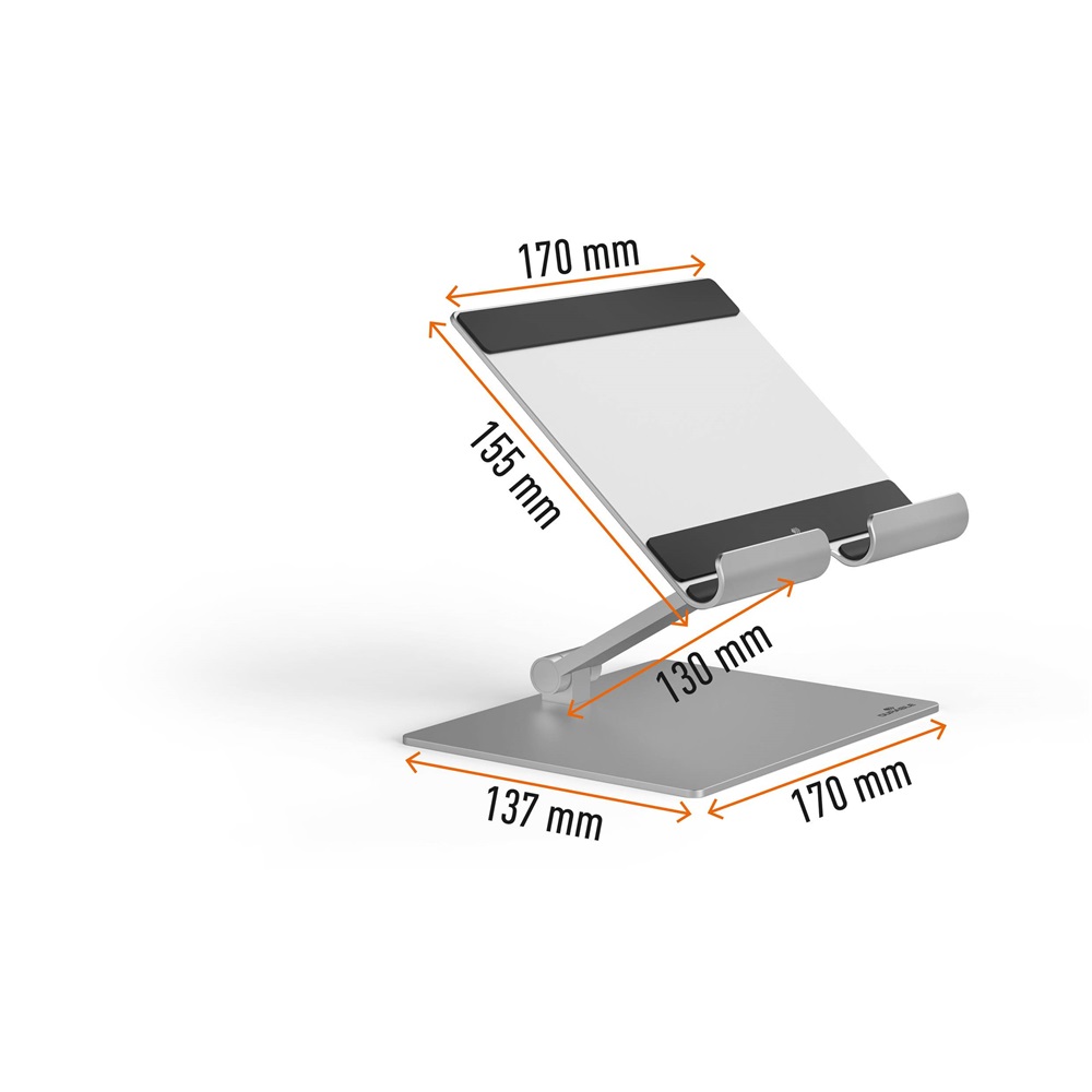 Univerzális tablettartó- állvány táblagépekhez és okostelefonokhoz ? Kompatibilis maximum 13′′ méretű eszközökkel ? Maximális terhelhetőség: 1000 g ? Az olvasási szög és magasság igény szerint beállítható, így jegyzetek írására vagy rajzolására is alkalmas ? Kényelmesen összecsukható és könnyen szállítható vagy tárolható ? A csúszásmentes szilikonbetétek védelmet nyújtanak a karcolások ellen ? Alumíniumból készült Katalóguskód: 47664