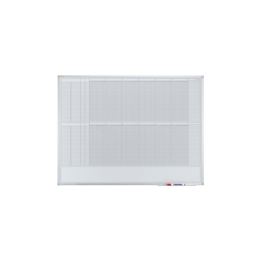 A tervezőtáblák környezetbarátak, mivel minden évben újrafelhasználhatók. Mágneses írófelület ezüst eloxált alumínium kerettel. Tartalmazza a tárolótálcát és a rögzítőanyagokat (tükörtartó, csavarok és tiplik). Éves tervezés 12 hónapra 30 pozícióval és egy extra jegyzetmezővel. Napi mező: 4 x 10 mm, indexmező: 171 x 10 mm. Méretek (Sz x M): 120 x 90 cm.