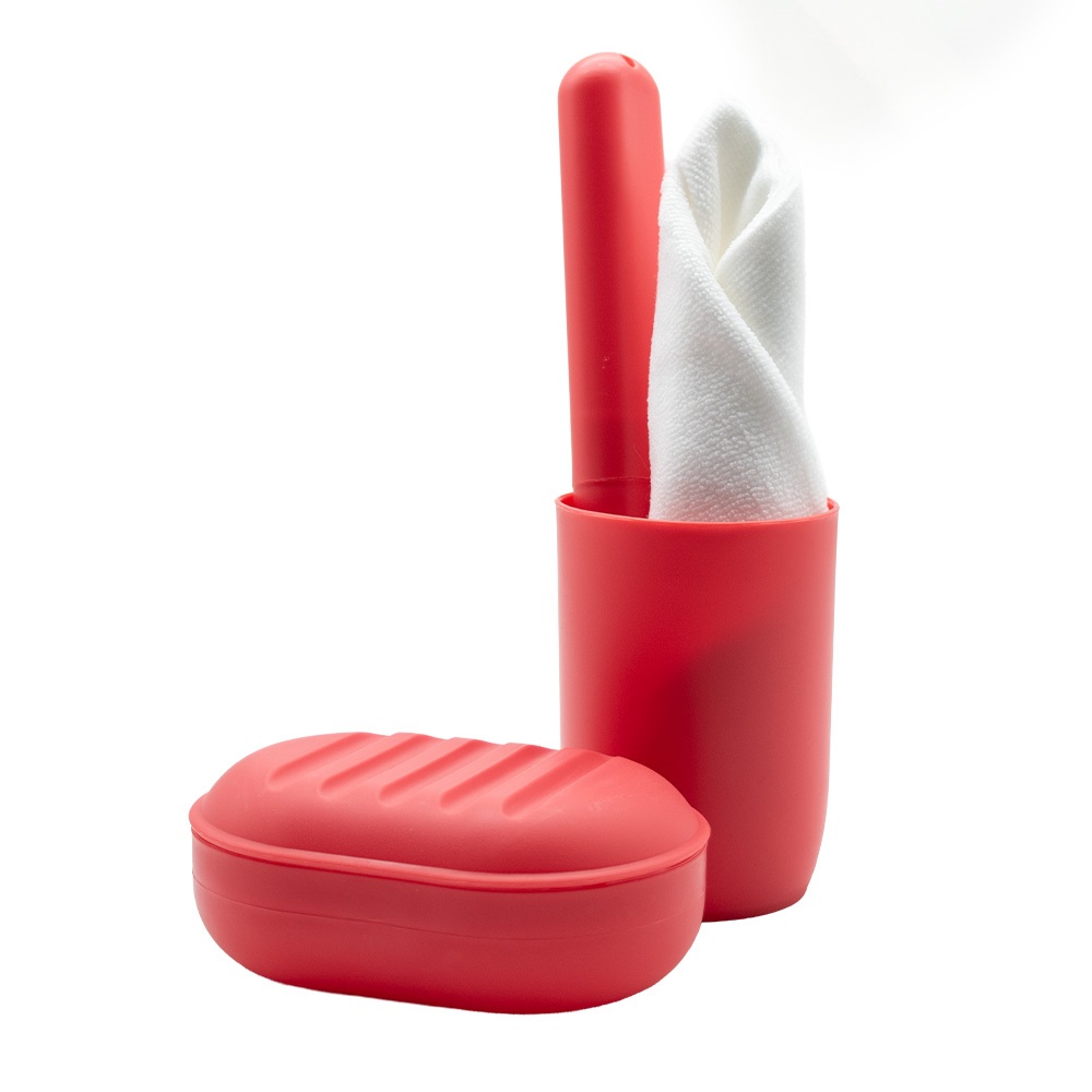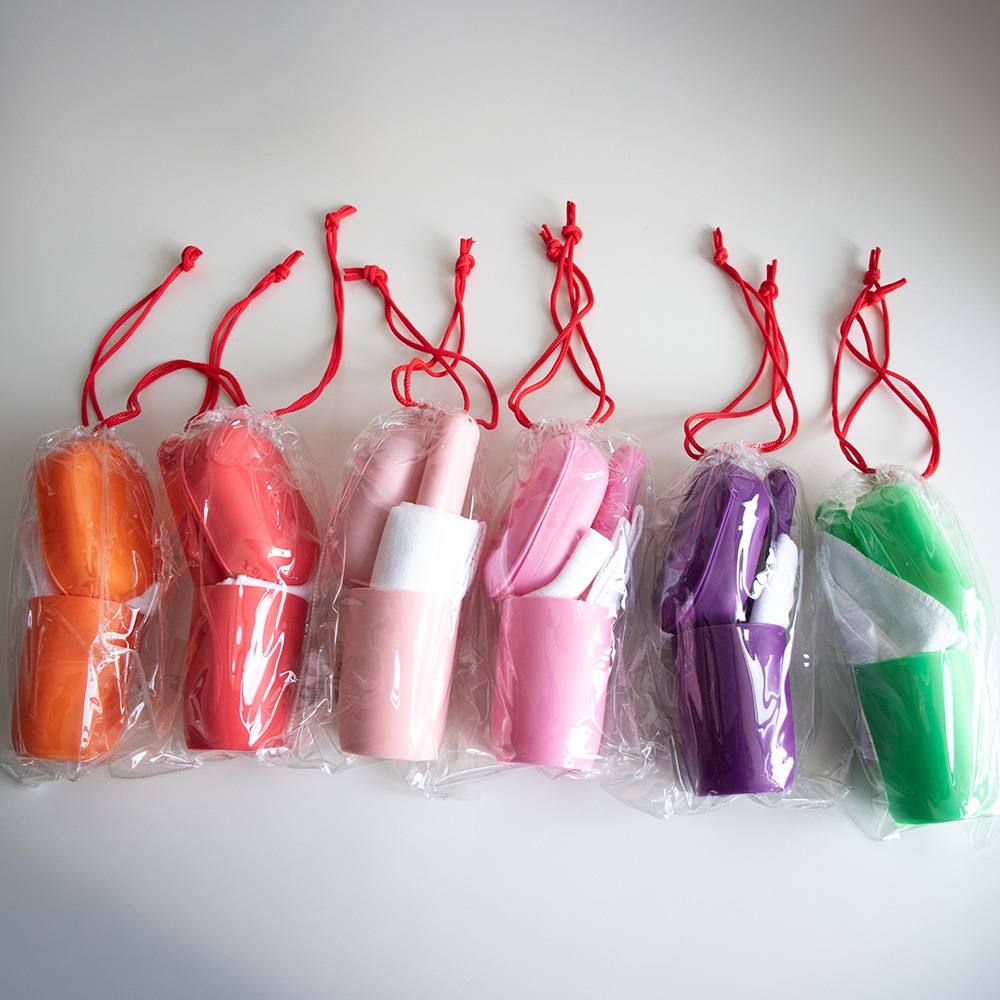 Tisztasági csomag összehúzható, zsinóros átlátszó zsákban. Tartalma: műanyag pohár, szappantartó, fogkefetartó, kéztörlő.