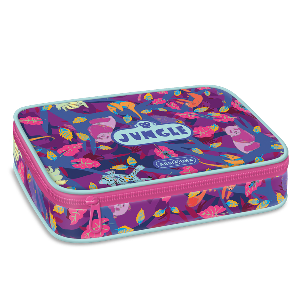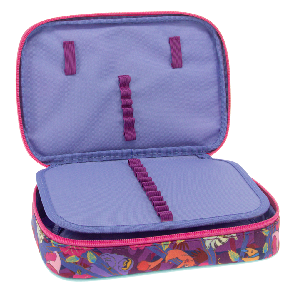 Többszintes, töltetlen, cipzáras tolltartó. Belül textillel bevont merev lapokkal, gumis kialakítással 30 ceruza számára az írószerek tárolásához és egy cipzáras belső zsebbel.