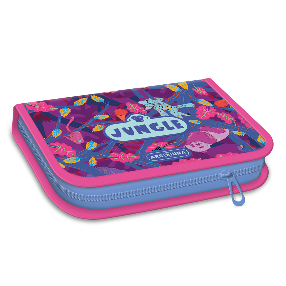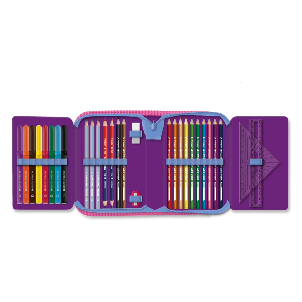 Írószerekkel töltött cipzáros tolltartó két kihajtható füllel, gumis kialakítással az írószerek tárolásához. Tartalma: 12 db színes ceruza, 3 db HB grafit ceruza, 1 vékony és 1 vastag postairón, 8 db színes filctoll, 1 db radír, 1 db hegyező, 1 db 17 cm-es egyenes vonalzó, 1 db háromszög vonalzó, órarend A és B hétre.