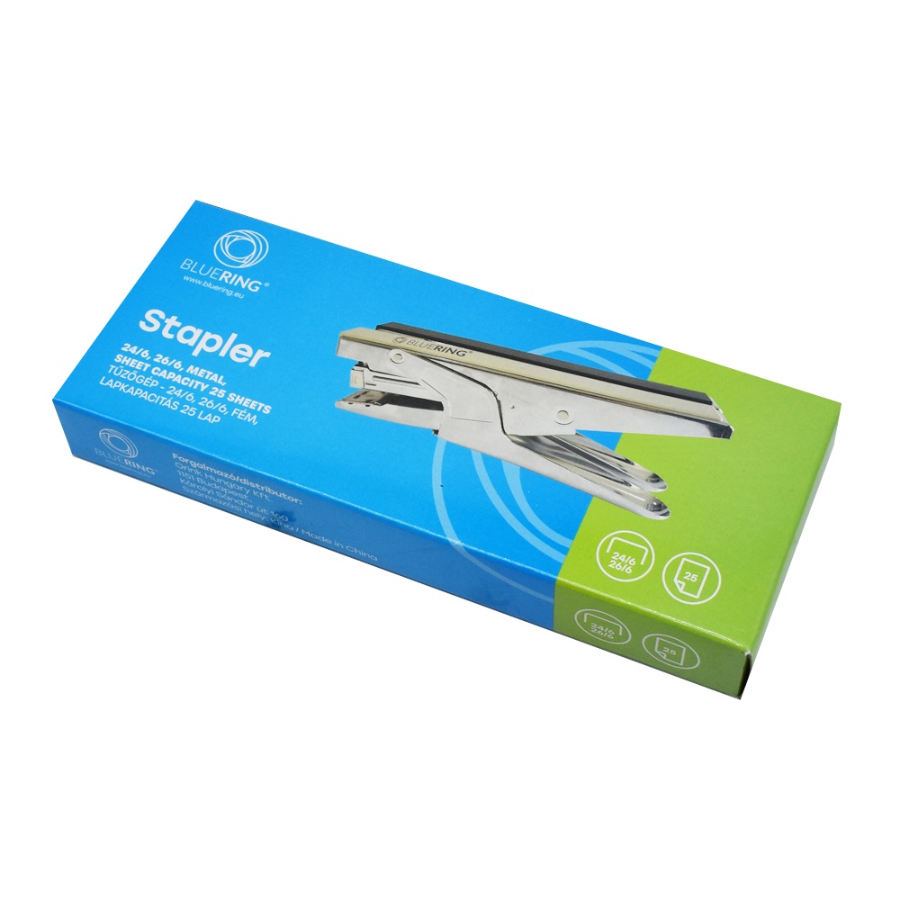 Kézi fém tűzőgép. Tűzés, fűzés funkció. 24/6 és 26/6 tűzőkapcsokhoz. Lapkapacitás: 25 lap. Tűzési mélység: 45 mm