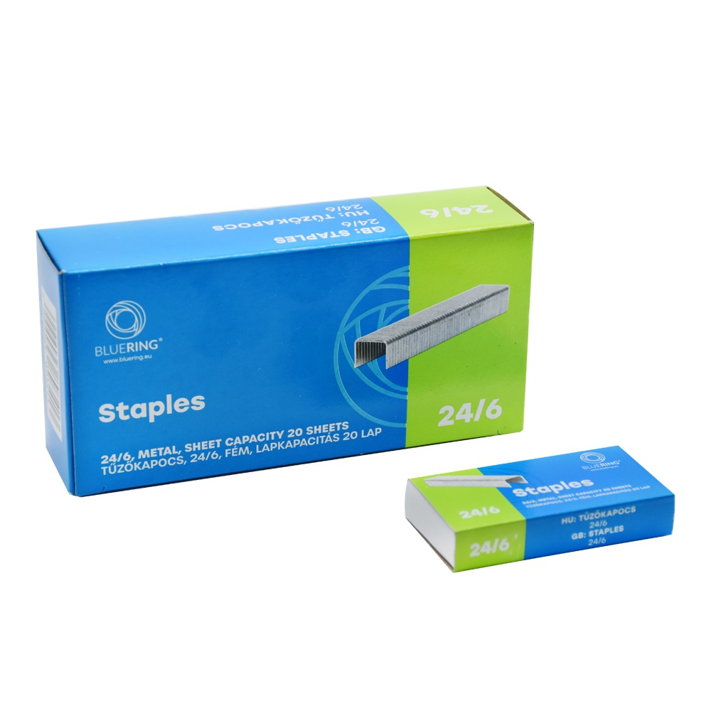 Bármilyen, 24/6 kapoccsal működő tűzőgéphez, lapkapacitás 20lap Gyűjtő: 10 doboz Karton: 50 doboz (50×10 doboz) 1000db/doboz Katalóguskód: 17934