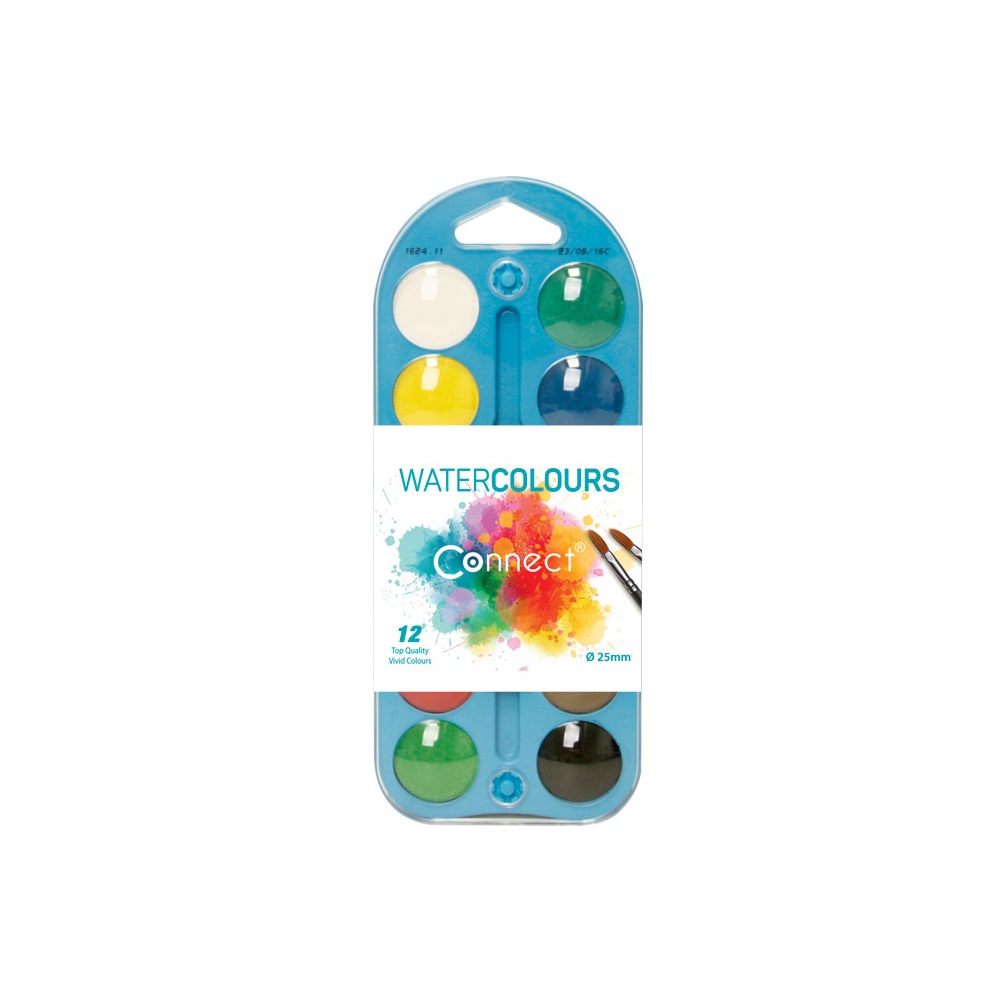 Élénk színekkel rendelkező vízfesték készlet, praktikus müanyag dobozban. Könnyen oldódik és egyenletesen fed. Festékgomb átmérő: 40 mm.
